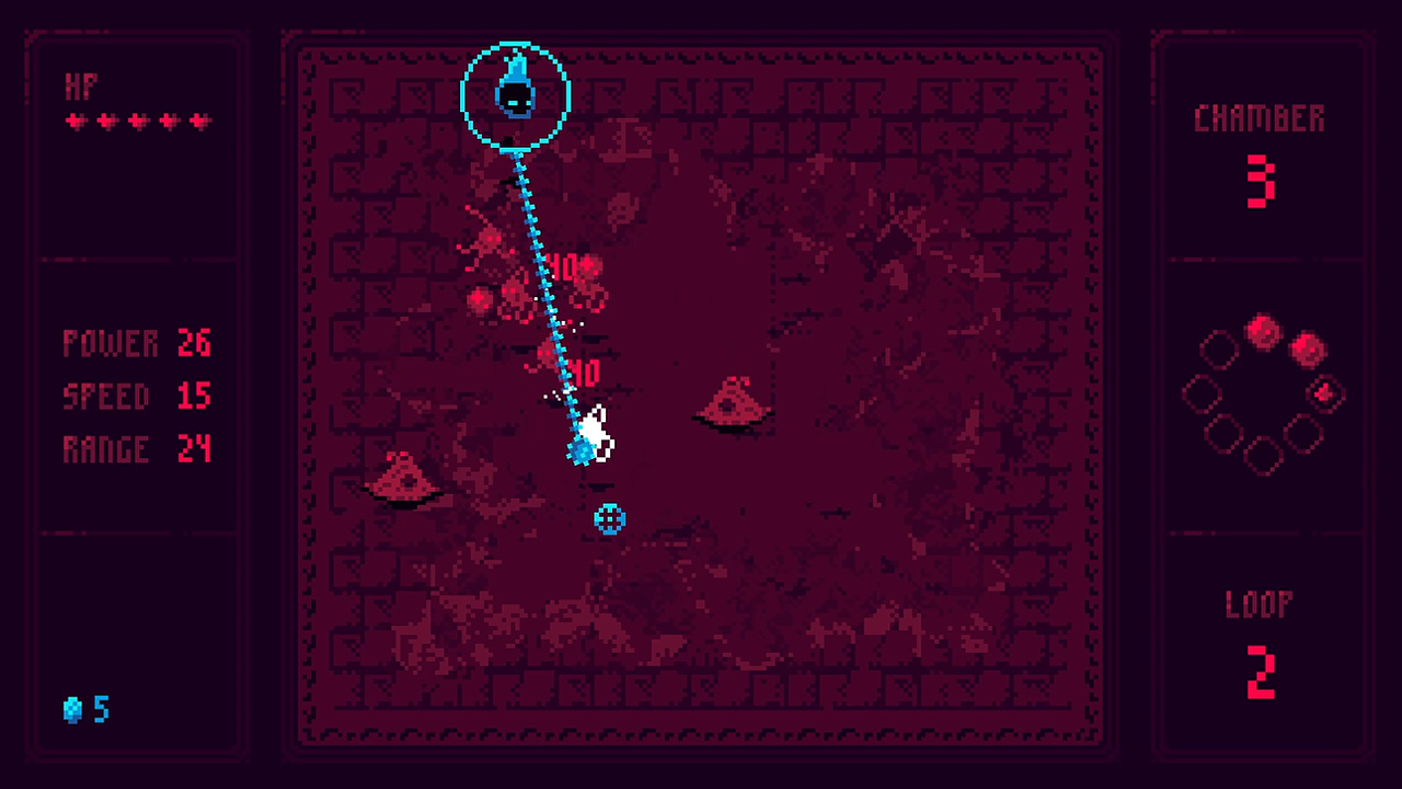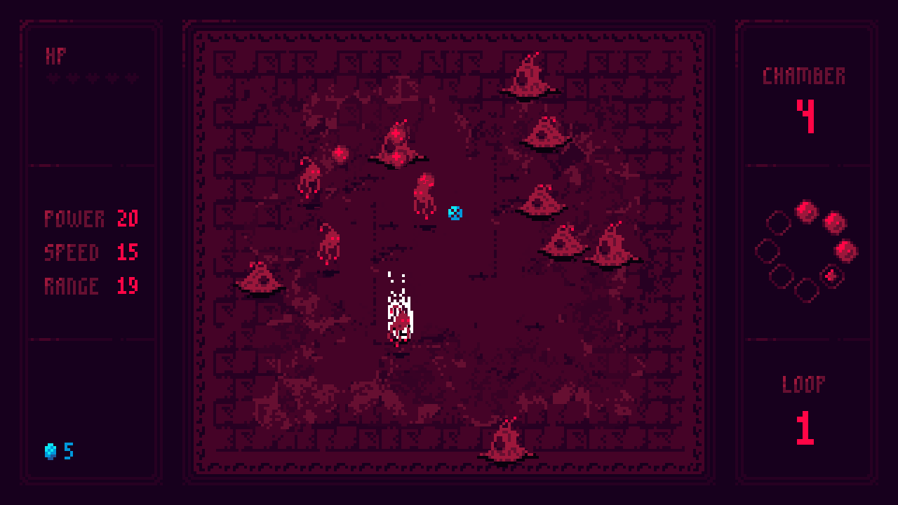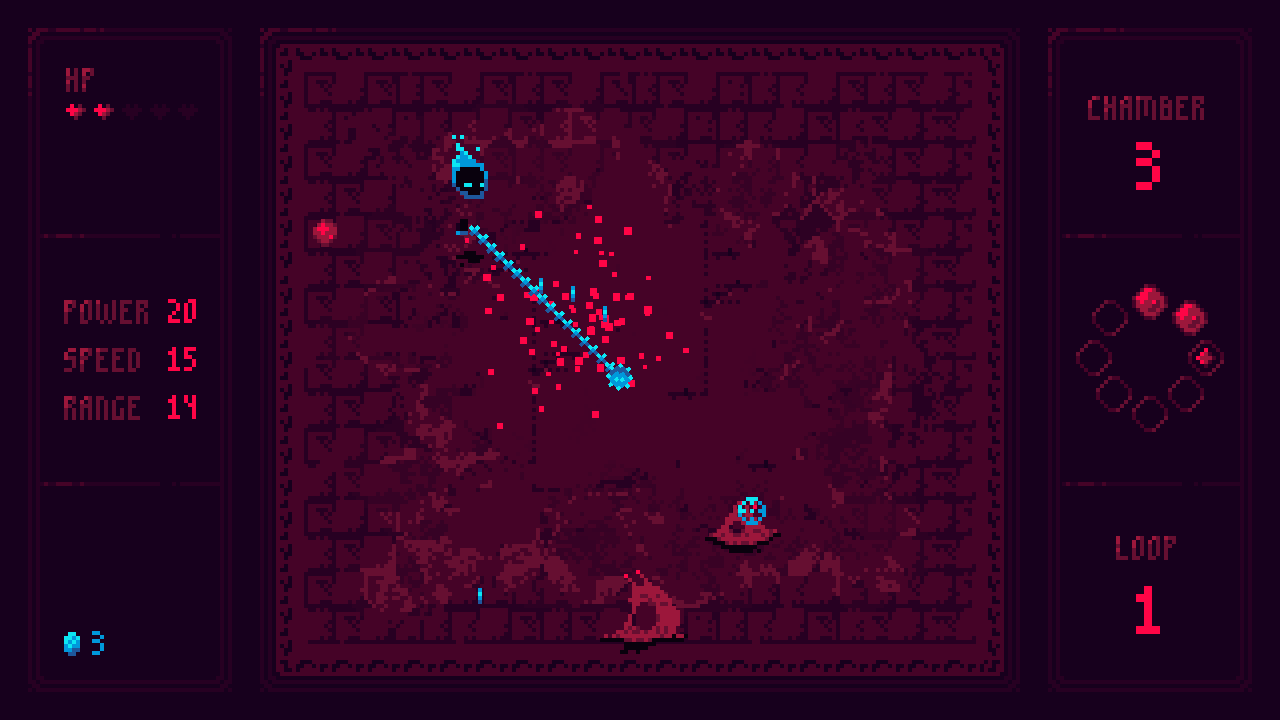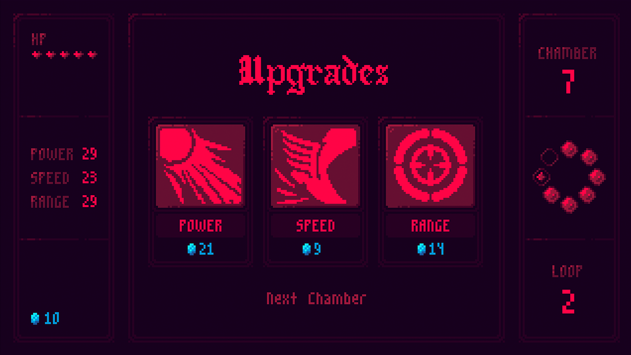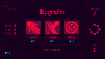 - Clear all enemies in a chamber to progress, earn gold, and purchase upgrades between fights.